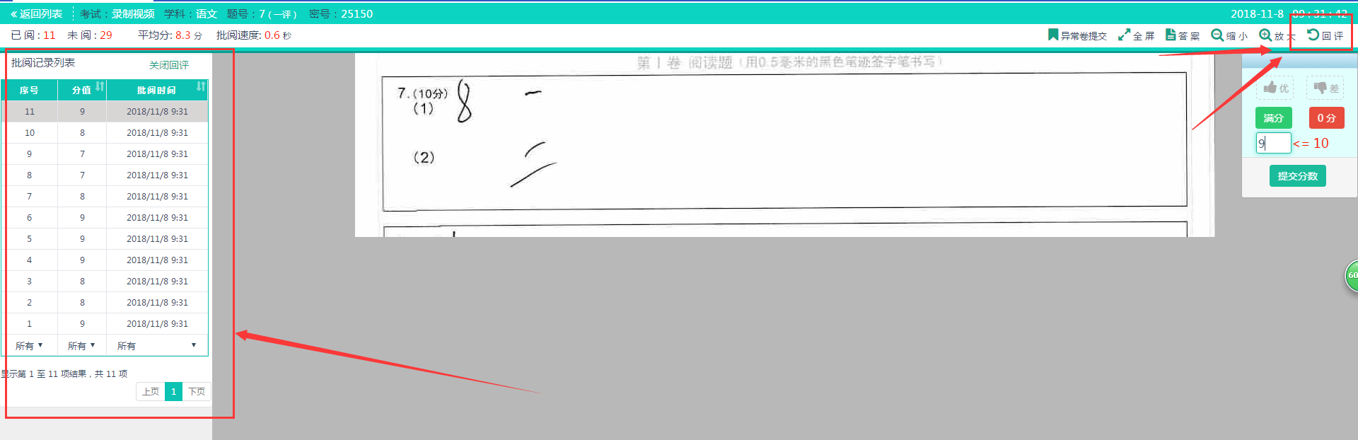 老师可通过回评,点击任一历史批改记录时,会呈现对应试题的切块,可在打分框修改分数并提交.