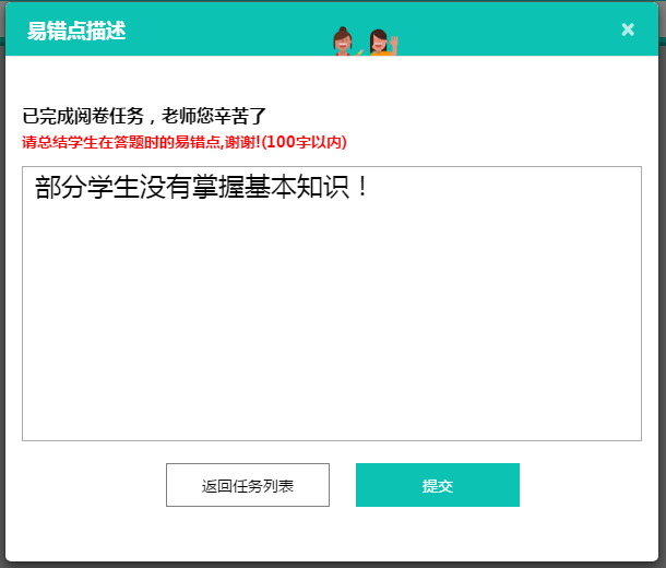 当未阅量显示为“0”且显示“已完成阅卷任务量,老师辛苦了”即完成该题阅卷任务,老师可以总结学生答题时的易错点,该描述会在成绩分析报告中呈现;