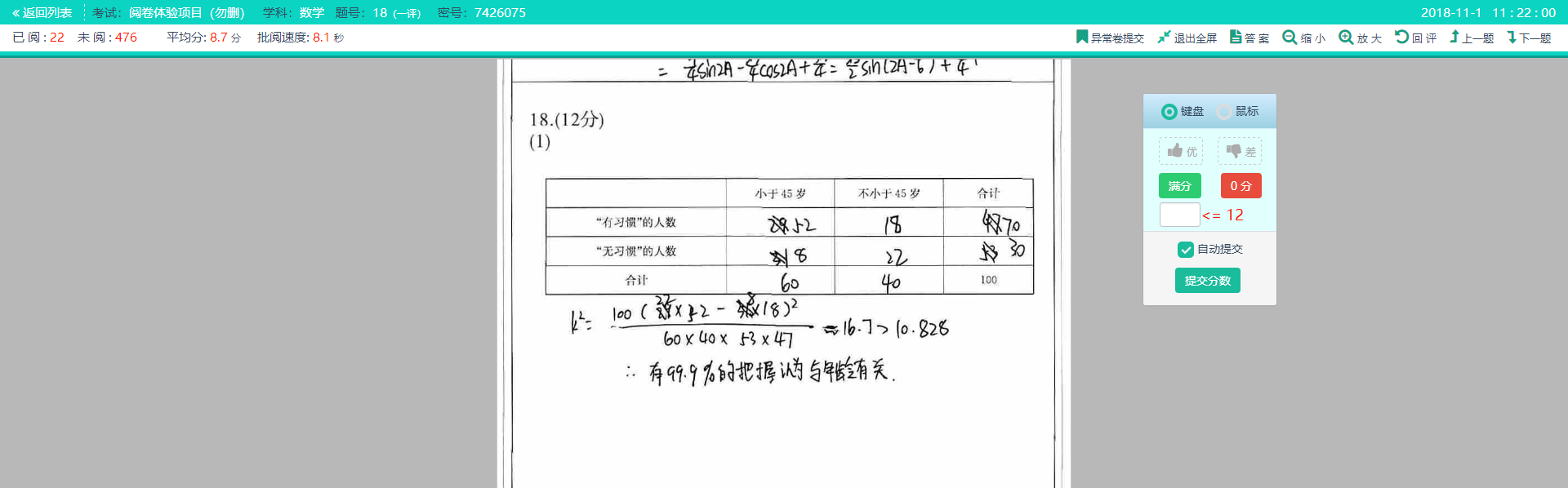 开始阅卷时,已阅量教师已经完成的阅卷数量,随着阅卷进度数量逐渐增加;未阅量为教师未完成阅卷数量,随着阅卷进度数量逐渐减少,在分发结束状态下,当未阅量为0时,阅卷结束;